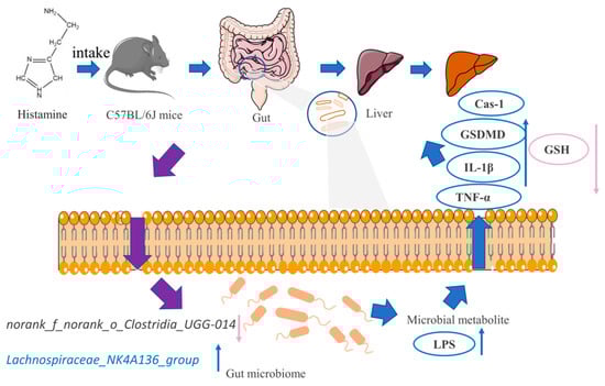A schematic model shows the mechanism of liver pyroptosis caused by oral histamine. Gut microbiota, oxidative stress, and inflammation are all affected.