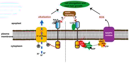 Schematic representation of the roles of FER in auxin-induced cell elongation and root hair growth. Two pathways have been reported to depict the roles of FER in auxin-induced root hair growth. In the first one, in the right side of the figure, FER regulates NADPH oxidase-dependent ROS accumulation through RAC/ROP to participate in auxin-induced root hair growth [12]. Specifically, the FER–ROPGEF module preferentially binds RAC/ROP in a GDP-dependent manner; upon signal activation, activated GTP-bound RAC/ROPs interact with NADPH oxidase to mediate ROS production, leading to root hair growth [12]. Additionally, LLG1 is a key component of the FER–ROPGEF–RAC/ROP signaling complex [24]. In the second pathway, on the left side of the figure, auxin regulates cell elongation by modulating the apoplast acidification in a FER-dependent manner. Specifically by binding its RALF ligand, FER induces phosphorylation of plasma membrane-localized H+-ATPase to inhibit proton transportation into the apoplast [27].