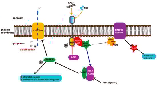 Schematic representation of the role of FER in the ABA signaling pathway. ABA directly represses ABI2 activity and releases activated SnRK2. Upon activation, SnRK2 induces expression of ABA-responsive genes and stomatal closure, inhibits H+-ATPase activity, and induces acidification of the cytosol, leading to inhibited cell growth. RALF and ABA increase the phosphorylation levels of FER, while FER activates ABI2 activity through the GEF1/4/10–ROP11/ARAC10 pathway, thereby inhibiting the ABA response [43]. FER also regulates ROS production through the GEF1/4/10-ROP11/ARAC10 pathway to regulate ABA-mediated stomatal closure [43]. ABI2 interacts with and dephosphorylates FER to suppress the FER–GEF–ROP pathway [44].