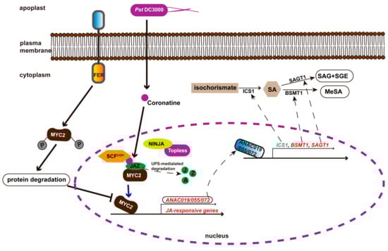 Schematic representation of the role of FER in regulating plant immunity through the JA and SA signaling pathways. Bacteria-secreted coronatine, which structurally and functionally mimics the active form of JA, utilizes MYC2 to activate the transcription factor NACs (ANAC019, ANAC055, ANAC072), which subsequently regulate the expression of genes involved in SA biosynthesis and metabolism to repress SA accumulation, and, thus, compromise plant immunity. FER regulates immunity by interacting with, phosphorylating, and destabilizing MYC2 to relieve the inhibitory effects of coronatine and JA on SA accumulation mediated by the MYC2–NACs module [73,101]. Red (BSMT1 and SAGT1) indicates activation, and green (ICS1) indicates suppression of transcription factor-regulated gene expression.