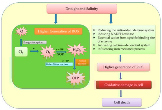 Around 1 to 2% of the oxygen (O2) utilized by plants is changed into reactive oxygen species (ROS), particularly singlet oxygen (1O2), hydroxyl radical (OH•), superoxide radical (O2•−), hydrogen peroxide (H2O2), alkoxyl radicals (RO•), peroxy radical (ROO•), and reactive nitrogen species (RNS), as a byproduct of aerobic metabolism in numerous cell organelles, like mitochondria, chloroplasts, nucleolus, and apoplasts [,]. Nevertheless, peroxisomes are also recognized to be powerful ROS generators, because photochemical reactions and ETC contribute the most of ROS production [,,,]. In plant cells, ROS tend to remain at a low level due to the antioxidant systems that regulate them. The rate of ROS production increases exponentially under conditions of drought and salinity stress, exceeding the capacity of antioxidant scavengers and causing an oxidative burst that interrupts the cellular redox homeostasis, affects biomolecules, and modulates the cellular mechanism, resulting in a negative balance between the production and scavenging of these reactive species [,,]. Conversely, controlled ROS production contributes to redox signaling, plant–microbe interactions [,], plant growth, and its development under abiotic stress [,,,]. Occasionally, ROS can damage molecular and cellular components (like nucleic acids, including DNA and RNA and proteins) by oxidizing biomolecules (such as carbohydrates, proteins, lipids, enzymes, and DNA), which can lead to severe plant death []. Despite this, the exact mechanisms of ROS-mediated stress alleviation remain unclear. To avoid damage and cell death, the elevated production of ROS and RNS should be suppressed by antioxidant machinery.