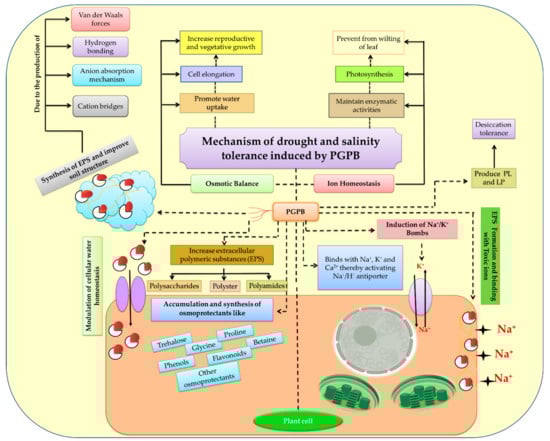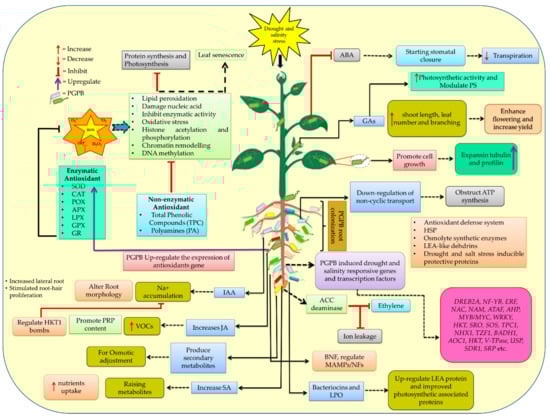 Plants respond to drought and salt stress through a variety of processes, including the production of distinct proteins, the secretion of metabolites, and the modulation of genetic expression. Several PGPBs play an essential role in the production of numerous phytohormones (such as IAA, GAs, cytokinin, etc.). These phytohormones play a critical role in regulating plants’ growth and response during salinity stress and water deficit conditions. When the plants are exposed to drought and salinity stress, these phytohormones stimulate various signaling pathways, which result in the greater production of secondary metabolites, antioxidant enzymes, and HSP. Hence, the study and development of numerous phytohormone-related strategies is necessary for increasing drought and salinity tolerance in plants [].