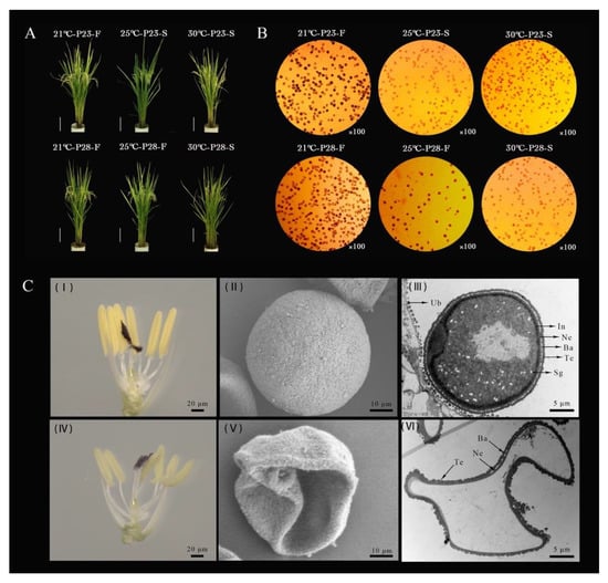 The near isogenic lines (NILs) PA2364S and PA2864S come from Peiai64S (PA64S) used in the study are PTGMS rice, which had been identified and bred by our research team for multiple generations. PA2364S has a fertility critical temperature of 23 °C, and, under long day (LD) conditions, male sterility manifested when the average temperature was above 23 °C, and males were fertile at average temperatures below 23 °C. PA2864S has a fertility critical temperature of 28 °C, and, under LD conditions, male sterility manifested when the average temperature was above 28 °C, and males were fertile at average temperatures below 28 °C. This experiment was conducted at the Crop Physiology and Production Centre of Huazhong Agricultural University (30.28° N, 114.20° E) during 2020–2021. Sowed annually on May 10, better growing seedlings were selected and transplanted into enamel pots to grow naturally. Three plants were transplanted into each pot, each limited to primary tillers. During this period, regular fertilizer, water and disease management was performed. According to the method of eight stage differentiation of young rice spikes [], when the plant population (50%) develops into the secondary stalk and spikelet primordium differentiation stage (3rd stage), the rice plants were moved to the plant growth chamber. The average temperatures were 21 °C, 25 °C and 30 °C with fluorescent light of 300 μmol/(m2·s) and relative humidity of 80% of PA2364S and PA2864S.