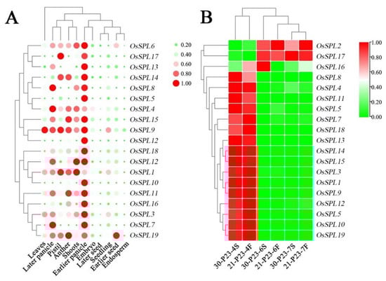 The gene expression analysis of OsSPL family in rice tissue. (A) Expression profiles of SPL gene family in different periods and tissues of rice. (B) Expression profiles of SPL gene family in young spikelets of fertility differential plants treated with different temperatures. 30/21. Treated at 30 °C or 21 °C. P23/P28. PA2364S/PA2864S. 4S/4F. The 4th stage sterile or fertile plants. For each treatment, the RNA-seq results show the average of three replicates.