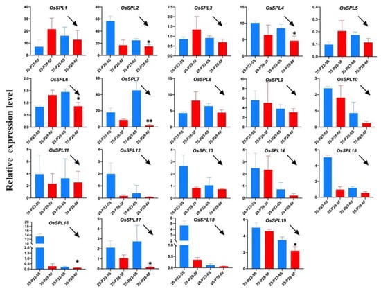 Expressions of OsSPL gene family in sterile and fertile panicles of PA2364S and PA2864S under 25 °C treatment. Here, 25: treated at 25 °C. P23/P28: PA2364S/PA2864S. Here, 5S/5F: fifth stage sterile or fertile plants. Arrows indicate the trend of gene expression at the sixth stage. For each treatment, the qPCR results show the average of three replicates. Here, p (*) < 0.05, p (**) < 0.01.