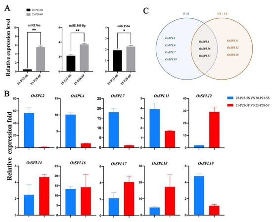 Expression of miR156/OsSPL module genes in sterile and fertile panicles of PA2364S and PA2864S at different temperatures. (A) Expression levels of miR156a, miR156k and miR156l-5p at sixth stages of 25 °C treatment in PA2364S and PA2864S. (B) Relative expression folds of the OsSPL genes targeted by miR156 responding to temperature changes. (C) Venn diagram of OsSPL genes in response to fertility changes and temperature changes. Here, 25: treated at 25 °C. P23/P28: PA2364S/PA2864S. Here, 6S/6F: sixth stage sterile or fertile plants. The blue bars in Figure 4 indicate the fold difference in gene expression between 25 °C and 30 °C treatment in P23 sterile plants, and the red bars indicate the fold difference in gene expression between 21 °C and 25 °C treatment in P28 fertile plants. For each treatment, the qPCR results show the average of three replicates. Here, p (*) < 0.05, p (**) < 0.01.
