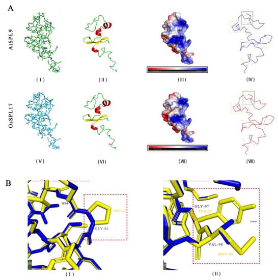Comparative analysis of AtSPL9 and OsSPL17 protein structures. (A) The stick structure (A(I,V)), secondary structure (A(II,VI)), surface electrostatic potential (A(III,VII)) and hydrogen bonding structure (A(IV,VIII)) of AtSPL9 and OsSPL17 proteins. (B) Differences in amino acid composition and protein structure between OsSPL17 and AtSPL9. In (A(II,VI)), the red part indicates the α-helix and the yellow part indicates the β-fold. In (A(IV,VIII)), the gray dashed lines indicate hydrogen bonds. In (B), the yellow and blue structures indicate the amino acid arrangement of AtSPL9 and OsSPL17, respectively. PRO: Proline. GLY: Glycine. TYR: Tyrosine. MET: Methionine. VAL: Valine.