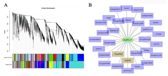 To investigate the potential role of OsSPL17 in the regulation of male fertility in rice, we performed WGCNA of the gene expression data from the obtained transcriptome. We clustered the genes into 30 related modules via association with male fertility traits (Figure 6A). After further analysis, we correlated the fertility related module with OsSPL17, which was finally identified in the darkturquoise module (Figure 6B). Several core genes were identified in the darkturquoise module, including OsSPL17. In particular, CHI and APX1 were identified among the co-expression genes of OsSPL17, which are critical genes for flavanone synthesis in the flavonoid pathway and major antioxidant enzymes in the ROS (reactive oxygen species) scavenging pathway, respectively. Flavonoids are inevitable for the formation of male fertility in rice. Meanwhile, our previous research found that, following the abnormal degradation of the tapetum in sterile anthers, ROS are essential for the initiation of the PCD process in the tapetum []. Therefore, the results indicated that OsSPL17 has the potential to regulate male fertility.