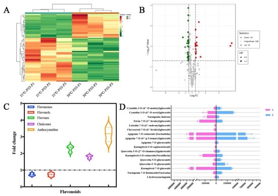 Analysis of flavonoid metabolites in anthers of fertility differential plants. (A) Cluster heatmap of differential metabolites. (B) Volcano Plots of differential metabolites. (C) Ratio of total class II flavonoid metabolites in fertile to sterile anthers. (D) Relative contents of different class II flavonoid metabolites in fertile and sterile anthers.