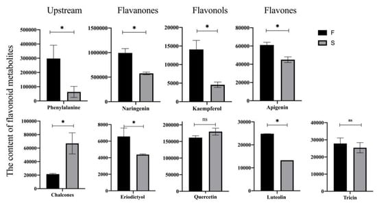 To further investigate the function of flavonoids in rice fertility, we extracted the major fractions of the different class II flavonoid metabolites in the anthers of fertile differential plants. Naringenin and eriodictyol substances were mainly extracted from flavanones, and they were both present in higher levels in fertile plants compared to sterile plants (Figure 8). Meanwhile, we also detected flavonols (kaempferol and quercetin), flavones (apigenin, luteolin and tricin) and chalcones. Apart from quercetin and chalcones, all substances were up regulated in fertile plants. This result indicates that fertile rice anthers have high levels of flavonoids, which are essential for the formation of male fertility in rice.