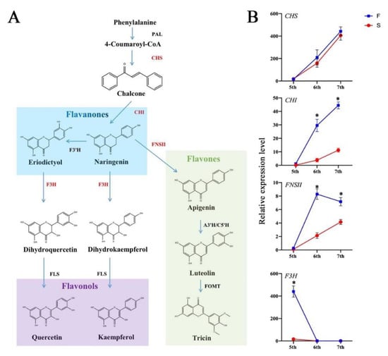 Rice flavonoid biosynthesis pathways and expression of genes encoding key enzymes. (A) Rice flavonoid biosynthesis pathway. (B) The relative expression level of genes encoding key enzymes in PA2364S. CHS, chalcone synthase; CHI, chalcone isomerase; F3H, flavanone 3-hydroxylase; FLS, flavonol synthase; FNSII, flavone synthase II; A3′H/C5′H, apigenin 3′-hydroxylase/chrysoeriol 5′-hydroxylase; FOMT, flavonoid O-methyltransferase. Sterisks indicate significant differences revealed by Student’s t-test at p < 0.05 (*).