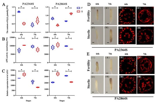 Effect of ROS and APX on the PCD process in the anther tapetum. (A) The content of H2O2 in PA2364S and PA2864S. (B) The APX activity in PA2364S and PA2864S. (C) The relative expression level of APX1 in PA2364S and PA2864S. (D) DAB staining and transferase mediated dUTP nick end labeling (TUNEL) assay of PA2364S (D) and PA2864S (E) anthers. Sterisks indicate significant differences revealed by Student’s t-test at p < 0.05 (*).