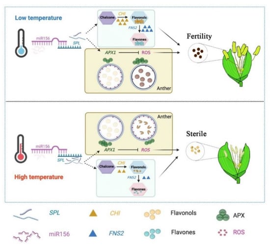 A model for OsSPL response to temperature change and involvement in the regulation of rice fertility. Under low temperature conditions, the miR156-OsSPL module regulated CHI expression in response to temperature changes, resulting in a strong synthesis of flavonols and flavones in the flavonoid pathway, providing sufficient flavonoid substances for the formation of fertile pollen. In addition, the miR156-OsSPL module regulates APX1 gene expression and controls the PCD process in the tapetum by affecting the APX-ROS balance, providing the material basis for the formation of fertile pollen.