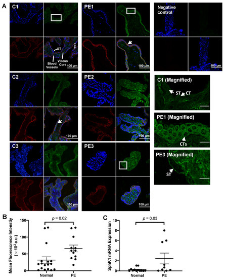 Placental biopsies were collected from placentas within 2 h of delivery from the area between the umbilical cord and the placental edge. Three evenly spaced 6 mm2 biopsies from each patient were embedded into one mold with Tissue-TekⓇ O.C.T. (#4583, ThermoFisher Scientific, Waltham, MA, USA). Three 8 μm sections from varying depths of one mold were cut on a cryostat and these sections were placed on a Superfrost slide (ThermoFisher Scientific, Waltham, MA, USA). The sections were fixed with 100% ice-cold methanol for 20 min in −20 °C and blocked for 1 h with 10% normal goat serum. The sections were then incubated in a moist chamber simultaneously with a rabbit anti-SphK1 primary antibody (1:80, ab46719, Abcam, Cambridge, UK) and a mouse anti-E-cadherin primary antibody (1:200, 55413, R&D Systems, Minneapolis, MN, USA) in 1× PBS overnight. Slides were washed 3 times with 1× PBS for two minutes per wash. AlexaFluor goat anti-rabbit 488 and goat anti-mouse 594 (1:200, A32731 and A11032, Invitrogen, Waltham, MA, USA) secondary antibodies were added simultaneously and incubated in the dark for 1 h at room temperature. After washing 3 times with 1× PBS, the sections were incubated for 10 min in the dark with DAPI (4′,6-diamidino-2-phenylindole, 1:100, D1306, Invitrogen, Waltham, MA, USA). The slides were washed again and mounted with PermaFluor Aqueous Mounting Medium (TA-030-FM, ThermoFisher Scientific, Waltham, MA, USA). Three randomly selected areas from each section were imaged using the 20× objective on Zeiss LSM 700 microscope and Zen Black software (Zeiss, Toronto, ON, Canada). Images were analyzed using ImageJ software (Version 1.52a, U.S. National Institutes of Health, Bethesda, MD, USA). Briefly, images were set to a consistent threshold value, and mean integrated density was calculated. Integrated density values were normalized to the number of nuclei in the image, which were calculated through the “Analyze particles” function on ImageJ. Normalized values for each sample were averaged and the standard error of the mean was determined.