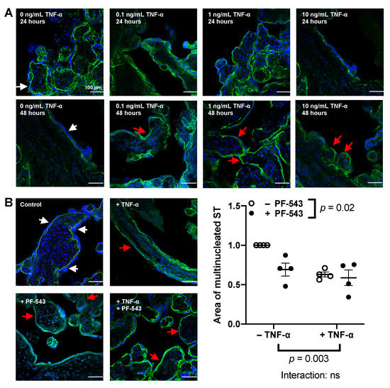 Since SphK1 expression and activity is increased in response to proinflammatory stimuli [43,44] and S1P increases epithelial cell extrusion [45], we investigated the effects of SphK1 inhibition, using PF-543, on ST formation, function, and shedding in normal and proinflammatory conditions. We first identified the concentration of TNF-α that demonstrated maximum effects on resyncytialization in the explant model. After the initial 4-day culture to allow syncytial shedding, the explants were treated with TNF-α for 24 or 48 h (n = 3). As shown in Figure 3A, resyncytialization of term placental chorionic explants from normal pregnancies increased from 24 to 48 h in the no-treatment control. After 48 h of incubation without TNF-α, the syncytium was relatively thick and consistent around the villi (white arrow). There were no overt differences seen with TNF-α treatment after 24 h among the different TNF-α concentrations and the no-treatment control. However, 48 h of treatment with 0.1, 1, or 10 ng/mL of TNF-α resulted in reduced syncytium (red arrows). Treatment with 1 or 10 ng/mL of TNF-α for 48 h led to the most consistent and reproducible hinderance of resyncytialization compared to the no-treatment control, and hence those were the chosen concentrations for further experiments.