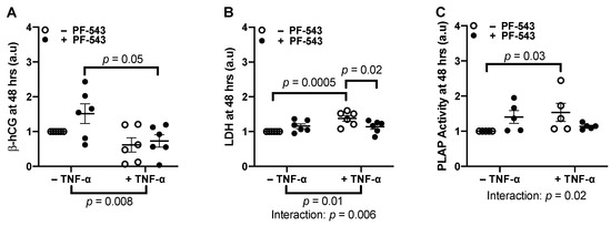Since 1 ng/mL TNF-α had no significant effects on β-hCG and LDH release, we tested whether a higher TNF-α concentration could hinder explant resyncytialization and increase cell death through SphK1. Explants were treated with 10 ng/mL TNF-α, 1 μM PF-543, or the combination of 10 ng/mL TNF-α and 1 µM PF-543 (n = 6). No significant changes were observed in β-hCG levels compared to controls in any of the groups at 24 h post-treatment (Supplementary Figure S2A). At 48 h post-treatment, however, 10 ng/mL TNF-α decreased β-hCG release (p = 0.008). However, inhibiting SphK1 (1 μM PF-543) did not counteract this decrease (Figure 4B). Furthermore, administration of 10 ng/mL TNF-α in explants with 1 μM PF-543 significantly decreased β-hCG levels to control levels compared to 1 μM PF-543 treatment alone (p = 0.05). This is likely due to the inhibitory effects of TNF-α as the treatment interaction was not significant. As well, β-hCG levels after co-treatment with PF-543 and TNF-α compared to TNF-α alone were not significant. This indicates that SphK1 activity does not mediate TNF-α effects on this ST endocrine function.