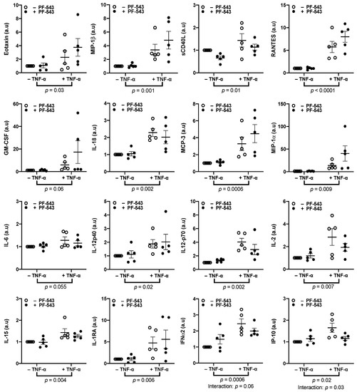 Inhibiting SphK1 with PF-543 diminished TNF-α effects on release of IFNα2 and IFN-γ associated protein 10 (IP-10). Explants were pre-cultured for 4 days prior to treatment with 10 ng/mL of TNF-α, 1 μM PF-543, a co-treatment of both, or a no-treatment control for 48 h. Supernatants were centrifuged at 15,000 RPM for 15 min prior to quantification of pro-inflammatory cytokines and chemokines using a multiplex array. Results were normalized against total protein mass, and normalized values were graphed as a ratio of change from the untreated control explant cultures. Results were analyzed by two-way ANOVA with the two-stage linear step-up procedure of Benjamini, Krieger, and Yekutieli post-hoc test. (n = 5, Mean ± SEM).
