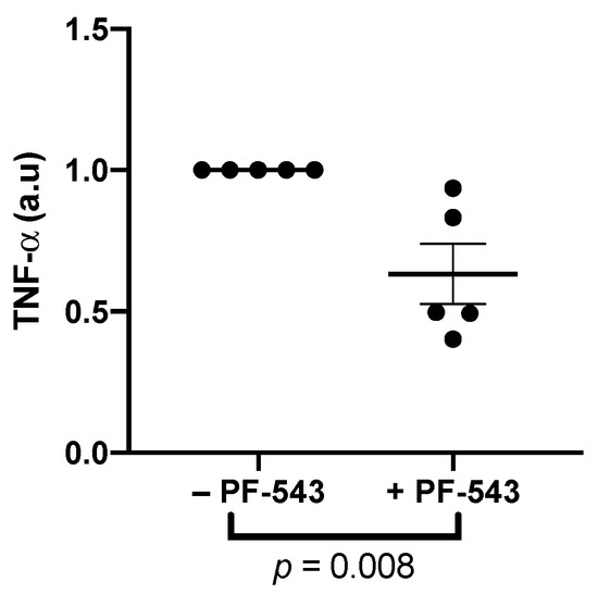 Inhibition of SphK1 decreased release of TNF-α. Explants were pre-cultured for 4 days prior to treatment with 1 μM PF-543 or a no-treatment control for 48 h. Supernatants were centrifuged at 15,000 RPM for 15 min prior to quantification of TNF-α using a multiplex array. Results were normalized against total protein mass, and normalized values were graphed as a ratio of change from the untreated control explant cultures. (n = 5, Mean ± SEM, Mann–Whitney test).