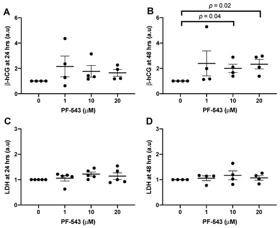 The dosage of 1 μM PF-543 to inhibit SphK1 was established based on effective dosages in other cell types that examined different outcome measures. However, the effects of PF-543 on placental explant resyncytialization or cell death have not been investigated. We therefore wanted to determine whether higher doses of PF-543, that are still highly specific for inhibiting SphK1, would lead to enhanced effects. Thus, a PF-543 dose-response was performed. Explants were treated with either 0 μM, 1 μM, 10 μM, or 20 μM of PF-543 (n = 4) on day 4 of explant culture. β-hCG and LDH levels were measured. With respect to ST endocrine function, no significant changes were observed in β-hCG at any PF-543 concentration after 24 h of treatment (Figure 8A). However, inhibiting SphK1 activity with 10 or 20 μM of PF-543 for 48 h increased β-hCG secretion (p = 0.04, p = 0.02, respectively; Figure 8B). No significant changes in LDH levels were observed at any concentration of PF-543 at either time point (Figure 8C,D).