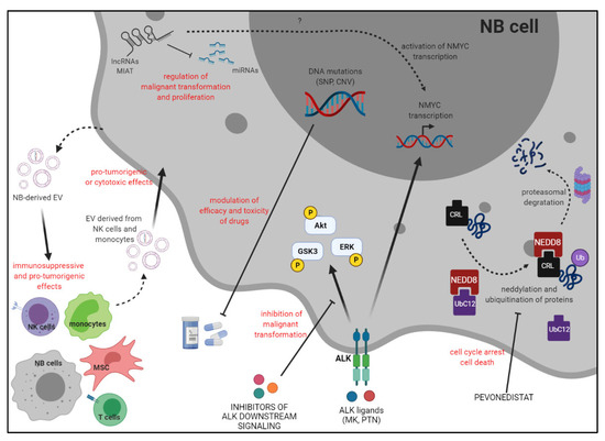 In this view, Foster and coworkers analyzed the effects of pevonedistat, an inhibitor of NEDD8, on NB cell lines in vitro, and in preclinical models of NB [2]. NEDD8 is involved in the neddylation of cullin–RING ligase (CRL) proteins, which target different proteins for ubiquitin-mediated destruction, including those involved in cell cycle progression. Thus, inhibition of the neddylation pathway may induce cell cycle arrest in tumor cells. In this study, the authors demonstrated that pevonedistat induced cytotoxicity in different human NB cell lines, with an IC50 ranging from 136 to 500 nM, independent of p53 status. However, they demonstrated that NB cell lines with wild-type p53 (p53wt) undergo cell death through apoptosis, whereas NB cell lines with mutated p53 (p53mut) follow a different mechanism. In addition, they demonstrated cell cycle arrest in G0/G1 for p53wt NB cell lines, whereas mutated p53 determined an arrest of the cell cycle in the G2/M phase, with an increased DNA content. Accordingly, CRL proteins are increased in NB cell lines after treatment with pevonedistat, but WEE1, a protein involved in cell cycle progression, was increased in p53mut NB cell lines and decreased in those with p53wt. However, preclinical studies performed with orthotopic xenografts of NB demonstrated that pevonedistat is effective in reducing tumor volume, independently of the p53 status of the NB cell lines injected [2]. Thus, this study highlighted a pathway that may be targeted by pharmacological inhibitors in NB, and paved the way for the design of novel phase I/II clinical trials for high-risk NB patients.