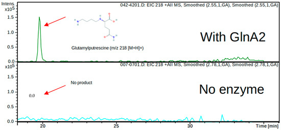 HPLC/ESI-MS analysis of the glutamylated reaction product generated by His-GlnA2. Two samples were analyzed in the MS positive mode (EIC—extracted ion chromatogram): reaction mixtures without addition of GlnA2 (below) and with addition of GlnA2 (above). Extracted ion chromatograms for the GlnA2 reaction product corresponding to gamma-glutamylputrescine with charge to mass ratio of 218 m/z is shown (above), and no product in the sample without GlnA2 could be detected (below). The chromatogram demonstrates detected peaks at the retention time 18 min and later (for full chromatogram see Figure S2).