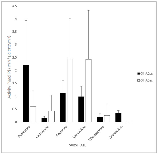 In order to study the enzymatic activity and substrate specificity of GlnA2, an adapted GS activity assay [30] based on the inorganic phosphate (Pi) released from ATP was used. An amount of 10 µg of His-GlnA2 enzyme was incubated with different polyamine substrates at a concentration of 50 mM. This assay was designed and optimized for rapid, high-throughput screening of different substrates in the microtiter format, allowing performance of multiple sets of kinetic experiments in parallel. The amount of released inorganic phosphate was quantified and expressed in nanomoles of Pi. The biochemical analysis of the GlnA2 activity and its substrate specificity using different polyamines revealed that GlnA2 can accept different polyamines as substrates (Figure 4 and Figure S3).