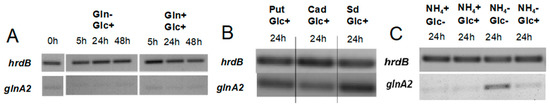 Transcription analysis of glnA2 in S. coelicolor M145 under different N-conditions. RT-PCR of glnA2 and hrdB in S. coelicolor M145 cultivated in minimal Evans medium with: (A) low 5 mM (Gln−) or high 50 mM (Gln+) glutamine concentration; (B) high 25 mM polyamine concentration (Put: putrescine, Cad: cadaverine, Sd: spermidine); (C) low 5 mM (NH4−) or high 50 mM (NH4+) ammonium/low 2.5 g/L (Glc−) or high 25 g/L (Glc+) glucose concentration. Total RNA was isolated from mycelium harvested after 0–48 h (A) or 24 h (B,C) of cultivation in the defined Evans medium.