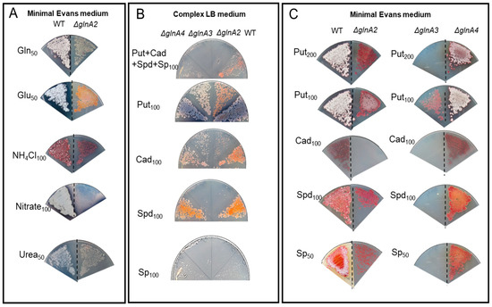 In order to investigate the role of glnA2 utilizing polyamines as a C- and N-source under starvation conditions, the phenotype of the glnA2 mutant was investigated on defined Evans-agar supplemented with the following nitrogen sources as sole N-source: ammonium (100 mM), polyamines putrescine (100 mM), cadaverine (100 mM), spermidine (100 mM), spermine (50 mM), glutamine (50 mM), nitrate (100 mM), glutamate (50 mM), and urea (50 mM). Growth of the parental strain and the mutants was monitored on defined Evans-agar after 5 days of incubation at 30 °C. The glnA2, glnA3, and glnA4 mutants could grow with glutamate, glutamine, ammonium, nitrate, and urea as sole N-source (Figure 6B). The parental strain S. coelicolor M145 as well as the glnA4 mutant could grow on all tested nitrogen sources (Figure 6B,C). The glnA2 mutant demonstrated reduced growth and no sporulation in the presence of the polyamines putrescine, spermidine, and spermine and no growth with cadaverine as a sole N-source. The glnA3 mutant revealed no growth in the presence of the polyamines putrescine (200 mM), cadaverine (100 mM), spermidine (100 mM), and spermine (50 mM). However, under 100 mM putrescine concentration, the glnA2 and glnA3 mutants could grow equally, though demonstrating delayed growth compared with the parental strain (Figure 6C). The complementation of the glnA2 and glnA3 mutants with a single gene copy under control of the strong constitutive promoter PermE restored the growth of these mutants on polyamine plates (Figure S6).