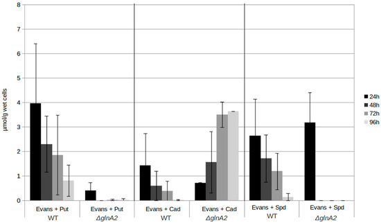 Intracellular polyamine concentration in S. coelicolor strains. The polyamine level of the ΔglnA2 mutant and parental strain S. coelicolor M145 was monitored in samples taken after 24, 48, 72, and 96 h of cultivation in defined Evans medium supplemented with polyamines (Put—putrescine; Cad—cadaverine, or Spd—spermidine, 25 mM of each) as a sole nitrogen source. The mean value of three biological replicates was calculated in μmol per 1 g of wet cells. Error bars indicate standard error of two biological replicates.