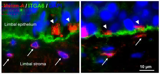 Localization of epithelial and stromal melanocytes at the human limbus in situ. Immunofluorescence double labeling of corneoscleral tissue sections prepared from two donor corneas (age 65 and 72 years) showing Melan-A+ melanocyte processes (arrowheads) in the basal limbal epithelium expressing integrin α6 (ITGA6) and additional Melan-A+ melanocytes (arrows) in the subepithelial limbal stroma; nuclear counterstaining with 4′,6-diamidino-2-phenylindole (DAPI).