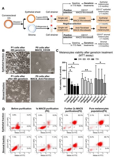 Isolation of limbal epithelial and stromal melanocyte populations using conventional geneticin treatment and magnetic-activated cell sorting. (A). Graphical representation of limbal melanocyte isolation: Differential enzymatic digestion of limbal tissue generated single-cell suspensions of epithelial and stromal cells; melanocytes were enriched from both suspensions either by conventional geneticin treatments or by magnetic-activated cell sorting (MACS) technology using either a positive selection approach with CD117 (c-Kit) Microbeads or a negative selection approach with CD326 (EpCAM) Microbeads and Anti-Fibroblast Microbeads, respectively. (B). Phase-contrast images showing epithelial (B) and stromal (C) cell fractions after 48 h of geneticin treatment at passage 1 (P1) and after MACS negative selection at passage 0 (P0). (C). Cell viability (MTT) assay after 24, 48, and 72 h of treatment with different concentrations of geneticin (100-400 µg/mL). Data (% of control) are expressed as means ± SD (n = 3) relative to control (* p < 0.05; ** p < 0.01; paired t-test). (D). Flow cytometry analysis showing an increase of Melan-A+/CD117+ cells in epithelial and stromal fractions after MACS purification steps.