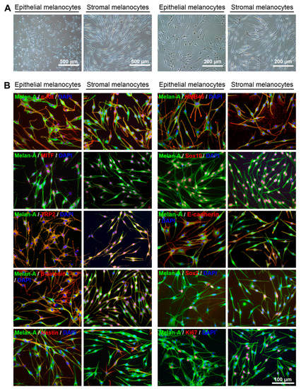 Phenotypic and immunocytochemical characterization of limbal epithelial and stromal melanocytes. (A). Phase-contrast images showing pure populations of epithelial and stromal melanocytes at passage 4 at two different magnifications. (B). Immunofluorescence double labeling of epithelial and stromal melanocytes for Melan-A and additional melanocyte-associated markers c-Kit (CD117), HMB45 (PMEL, premelanosome protein), MITF (microphthalmia-associated transcription factor), Sox10 (SRY-box transcription factor 10), TRP2 (tyrosine-related protein 2), E-cadherin, ß-catenin, Sox2, nestin, and Ki-67; nuclear counterstaining with 4′,6-diamidino-2-phenylindole (DAPI). The magnification bar at the bottom-right corner applies to all images.