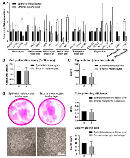 Epithelial and stromal melanocytes did, however, not differ significantly in their proliferative potential (Figure 4B) or melanin content (Figure 4C). Using melanocytes as feeder layers for LEPCs, both epithelial and stromal melanocytes supported the clonal growth of LEPCs. Colony-forming efficiency and colony growth area exhibited no significant differences between the two feeder layers indicating that both populations may be suitable for supporting LEPCs in tissue engineering approaches (Figure 4D).