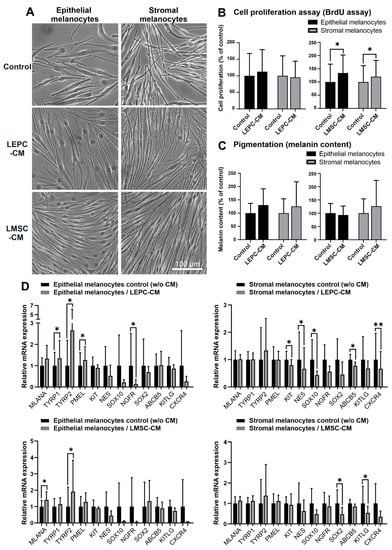 Effects of soluble factors on limbal epithelial and stromal melanocytes. (A). Phase-contrast images of limbal epithelial and stromal melanocytes cultured in conditioned media derived from limbal epithelial stem/progenitor cells (LEPC-CM) and limbal mesenchymal stem cells (LMSC-CM) (the magnification bar at the bottom-right corner applies to all images). (B). The effect of LEPC-CM and LMSC-CM on the proliferation of limbal epithelial and stromal melanocytes was analyzed by BrdU incorporation assay after 72 h. Data are expressed as means ± SD (n = 4) relative to control (* p < 0.05; paired t-test). (C). The effect of LEPC-CM and LMSC-CM on the melanin content of limbal epithelial and stromal melanocytes was analyzed by pigmentation assay after 72 h. Data are expressed as means ± SD (n = 4) relative to control. (D). Quantitative real-time polymerase chain reaction (qRT-PCR) primer assays showing relative expression levels of MLANA (Melan-A), TYRP1 and TYRP2 (tyrosinase-related protein 1 and 2), PMEL (premelanosome protein), KIT (c-Kit/CD117), NES (nestin), SOX10 (SRY-Box transcription factor 10), NGFR (nerve growth factor receptor), SOX2 (SRY-Box transcription factor 2), ABCB5 (ATP binding cassette subfamily B member 5), KITLG (Kit ligand), and CXCR4 (stromal cell-derived factor 1 receptor) in limbal epithelial and stromal melanocytes cultured in LEPC-CM and LMSC-CM. Data are normalized to GAPDH and ACTB and expressed as means (2−ΔCT × 1000) ± SD (n = 4) relative to control (* p < 0.05; ** p < 0.01; paired t-test).
