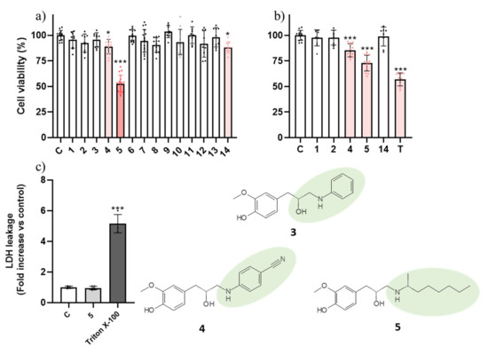 Viability of AGS cells exposed to the molecules at 200 μM (a) and 100 μM (b). The effect of topotecan at 5 μM is also presented in (b) for benchmark purposes. (c) Influence of molecule 5 (100 μM) on membrane integrity of AGS cells after 24 h. Triton X-100 at 1% was used as a positive control for maximum extracellular LDH activity. Each dot represents a single determination. C: control; T: topotecan. * p < 0.05; *** p < 0.001.