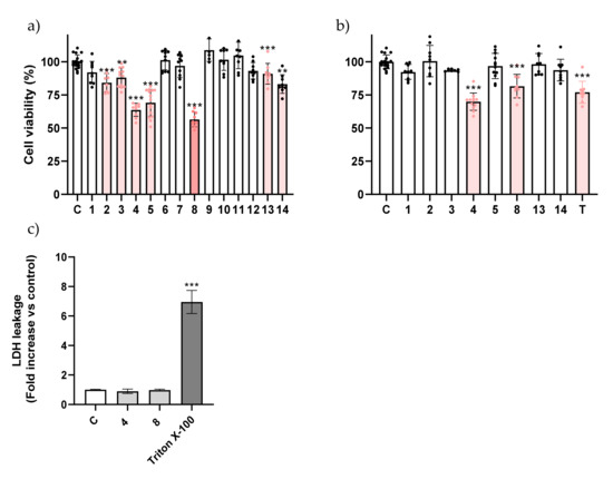 Viability of A549 cells exposed to the molecules at 200 μM (a) and 100 μM (b). The effect of topotecan at 5 μM is also presented in (b). (c) Influence of molecules 4 and 8 at 100 μM on membrane integrity of A549 cell line after 24 h. Triton X-100 at 1% was used as a positive control for maximum extracellular LDH activity. Each dot represents a single determination. C: control; T: topotecan. ** p < 0.01 *** p < 0.001.