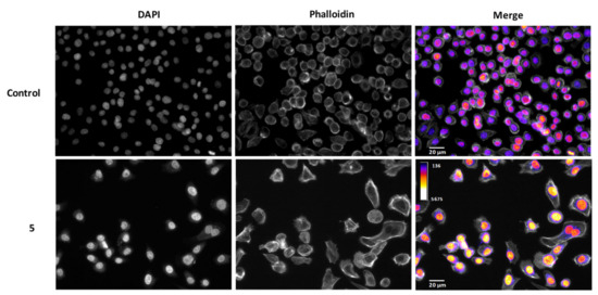 Morphological assessment of AGS cells incubated with compound 5 (100 µM, 24 h). DNA was studied using DAPI and overall cell morphology with phalloidin.