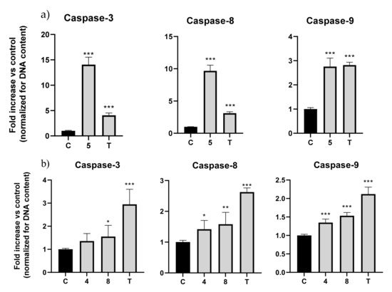 Fold increase (normalized for DNA content) in caspase-3, -8, and -9 activation in (a) AGS with molecule 5 and (b) A549 with molecules 4 and 8. Topotecan at 2.5 μM was used as positive control. The values were normalized for DNA content; C: control; T: topotecan. * p < 0.05; ** p < 0.01; *** p < 0.001.