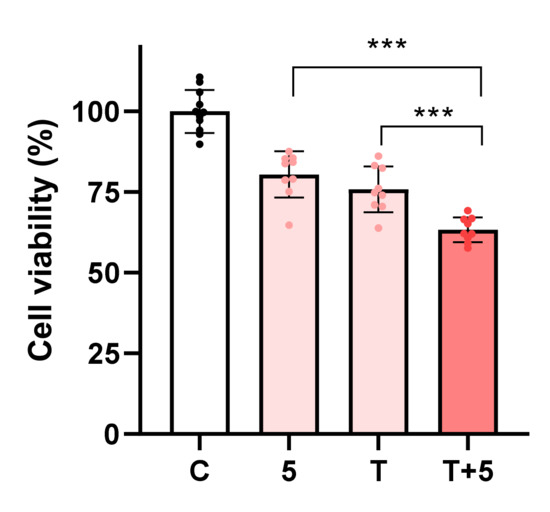 Viability of AGS cells exposed to molecule 5 at 100 μM combined with topotecan at 2.5 μM. Each dot represents a single determination. C: control; T: topotecan. *** p < 0.001.