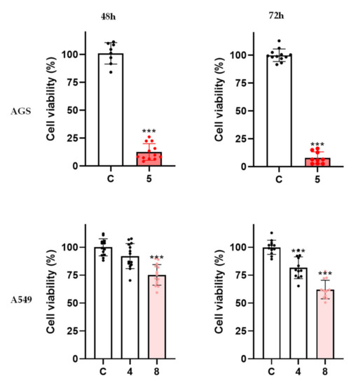 Viability of AGS cells exposed to molecule 5 (100 μM) at 48 h/72 h and viability of A549 cells exposed to molecules 4 and 8 (100 μM) at 48 h/72 h. The results correspond to the mean value for at least three independent experiments performed in triplicate. Each dot represents a single determination. C: control; *** p < 0.001.
