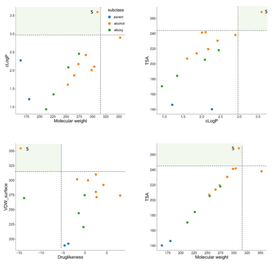 We also tried to understand whether the physicochemical properties of the molecules could be related to their activity. To this end, we calculated several properties of all molecules synthesized and tested (Table 1). Taking as example molecule 5, which was the most potent molecule found in this evaluation, it was clear that when creating a 2D-chemical space consisting of distinct molecular descriptors (molecular weight, cLogP, TSA, VDW volume, and drug-likeness, among others), there are several combinations of descriptors in which compound 5 is clearly separated from the other molecules (Figure 7). This is a very important information as it shows that a chemometric analysis in tandem with structure−activity relationships and biological assessment can help us map and define the chemical spaces that are most likely to yield active molecules in the future. As such, the properties found here for the most potent molecule can guide future development of novel drugs by defining the ideal set of physicochemical properties.