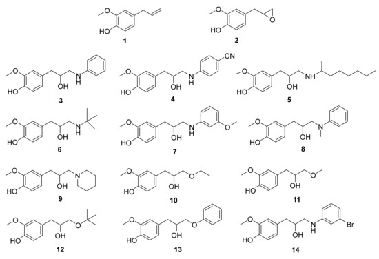 Chemical structures of eugenol 1, epoxide 2, β-amino alcohols (3–9, 14) and β-alkoxy alcohols (10–13), obtained through different reactions between eugenol epoxide 2 and several amines or alcohols, respectively.