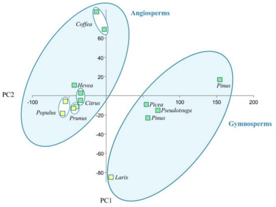 - Gernandt, D.S.; Willyard, A.; Syring, J.V.; Liston, A. The Conifers (Pinophyta). In Genetics, Genomics and Breeding of Conifers; Plomion, C., Bousquet, J., Kole, C., Eds.; CRC Press: Boca Raton, FL, USA; Science Publishers: New York, NY, USA, 2011; pp. 1–39. ISBN 9780429065934. [Google Scholar]