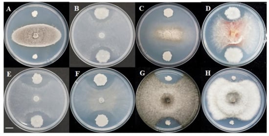 Antagonistic activity of B. velezensis GS-1 against plant pathogenic fungi. (A) Magnaporthe oryzae, (B) Rhizoctonia solani, (C) Botrytis cirerea, (D) Fusarium graminearum, (E) Sclerotinia sclerotiorum, (F) Cercospora zeae, (G) Setosphaeria turcica, (H) Cochiliobolus heterostrophus. Scale bar: 1 cm.