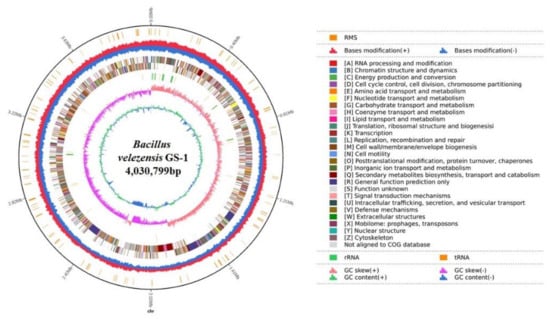 Circular genome map of B. velezensis GS-1. From the innermost to the outermost: ring 1 for GC content, ring 2 for GC skew, ring 3 for distribution of rRNAs (green) and tRNAs (brown), ring 4 for COG classifications of protein-coding genes on the forward strand and reverse strand, ring 5 for restriction modification system, and ring 6 for genome size (black line).