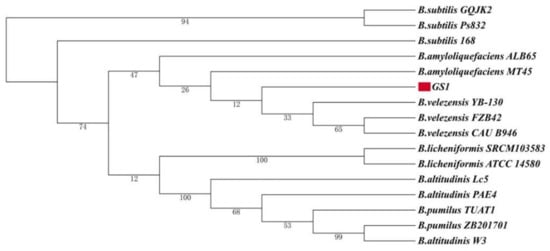 Phylogenetic tree of GS-1 and 15 other Bacillus species based on 16S rRNA sequence analysis. The red color indicated the strain GS-1 isolated in this study.