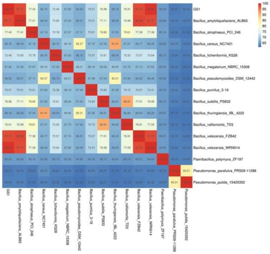 The 16S rRNA gene sequences of B. velezensis GS-1 and 15 Bacillus species were used to construct a phylogenetic tree. From the phylogenetic tree, we found that B. velezensis Gs-1 was related most closely to the three B. velezensis strains, B. velezensis YB-130, B. velezensis FZB42, and B. velezensis CAU B946 (Figure 3). Furthermore, ANI analysis was conducted between GS-1 and the other 15 Bacillus species, and GS-1 showed highest values with B. velezensis CAU B946 (99.47%), followed by B. velezensis YB-130 (97.78%) and B. velezensis FZB42 (97.73%) (Figure 4). This was consistent with the result shown in the 16S rRNA phylogenetic tree. In addition, strain GS-1 also showed close relationships with B. amyloliquefaciens ALB 65 (97.71%) and B. amyloliquefaciens MT 45 (94.08%) in ANI analysis. The taxonomic identities of the GS-1 and the related strains were further confirmed by TYGS server. Based on genomic evidence, GS-1 was also confirmed as B. velezensis. But, the dDDH values from TYGS were a little lower than the values from ANI. For example, the ANI values of GS-1 compared with B. velezensis WRN014 and B. velezensis FZB42 were 99.24% and 97.73%, but only 94.5% and 80.3% in TYGS analysis. In addition, the percentage of G + C of GS-1 was 46.3%, the same as B. velezensis WRN014, and little lower than B. velezensis FZB42 (46.5%). These results indicated that GS-1 was closer to B. velezensis WRN014. Based on all the evidences mentioned above, strain GS-1 was classified as B. velezensis.