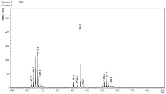 Plate diffusion assays were used to test the inhibitory activity of crude lipopeptide extracts from B. velezensis GS-1 to plant pathogens; these extracts showed strong antagonistic ability to a variety of plant pathogens. The mycelium growth of M. oryzae and S. turcica were inhibited significantly, and the inhibition zone caused by CLE were 2.7 mm and 3 mm, respectively. S. sclerotiorum were inhibited slightly (Figure 6). MALDI-TOF MS was used to confirm the components in CLE. The first obvious peaks with m/z of 1030.7, 1044.7, 1072.8, and 1088.7 were predicted to belong to the surfactin family. The second peaks at a m/z of 1311.5, 1336.5, 1354.5, and 1376.5 were predicted to belong to the plantazolicin family. Lastly, peaks at a m/z of 1513.9, 1531.9, and 1560.8 were predicted to belong to the fengycin family (Figure 7).
