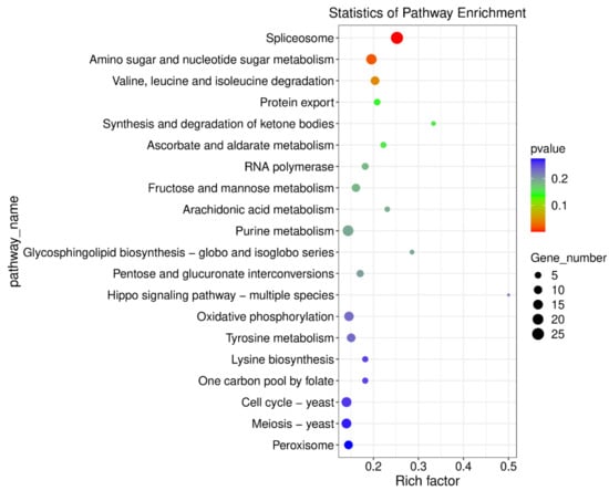 To determine the global changes in gene expression, RNA-seq analysis was conducted to investigate the transcriptome of the effect of lipopeptide extracts on M. oryzae. DEGs were identified by comparing RNA sequence data from the lipopeptide extracts treatment with the control group. Genes with transcript levels log2FoldChange >1 and statistical significance (p < 0.05) were selected as DEGs. In total, 1689 DEGs were identified, and 657 DEGs were upregulated and 1032 DEGs were downregulated. To gain better insight into which biological processes were downregulated or upregulated by lipopeptide extracts treatment, Gene Ontology analysis was performed. Based on GO functional annotation, DEGs were categorized into three classes: cellular components, molecular functions, and biological processes. In category of biological processes, the most enriched were the oxidation-reduction process, transmembrane transporter, regulation of transcription, and pathogenesis. The most enriched biological processes in category of cellular component were nucleus, cytosol, cytoplasm, and integral component of membrane. However, the zinc ion binding, DNA binding, ATP binding, and RNA polymerase II transcription factor activity were mostly enriched in category of molecular function. The top 20 KEGG pathway enrichment analyses revealed that DEGs were involved mainly in the spliceosome, amino sugar and nucleotide sugar metabolism, valine, leucine and isoleucine degradation, fructose and mannose metabolism, purine metabolism, oxidative phosphorylation, tyrosine metabolism, starch and sucrose metabolism, and autophagy (Figure 8). Among the DEGs, some genes related to tyrosine metabolism (copper amine oxidase, MGG_13291), peroxisome (superoxide dismutase, MGG_07697), riboflavin metabolism (MFS transporter, MGG_00275), and ABC transporter (multidrug resistance protein 1, MGG_00239; cytochrome P450 monooxygenase, MGG_07593) were upregulated significantly. While, some genes involved in autophagy (sec17), DNA repair protein (RAD14, MGG_06208; RAD5, MGG_05032), and histone deacetylase (HDA1, MGG_01076; RPD3, MGG_05857) were downregulated obviously.