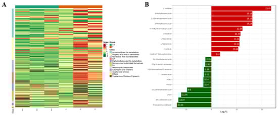 (A) Heatmap of differentially accumulated metabolites. (B) Top 10 DAMs in control and treatment.
